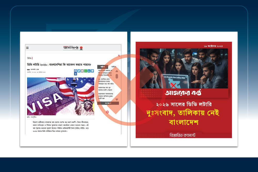 ২০২৬ সালের ডিভি লটারির তালিকাতে বাংলাদেশের নাম না থাকাকে বাংলাদেশের ‘দুঃসংবাদ’ বলে ১৯ অক্সটোবর ২০২৫ তারিখে খবর প্রকাশ করেছে দৈনিক পত্রিকা জনকণ্ঠ। প্রতিবেদনে বলা হয়েছে, এশিয়ার দেশগুলোর তালিকা থেকে বাংলাদেশকে বাদ দেওয়া হয়েছে। এর ফলে বাংলাদেশি নাগরিকরা এবার ডিভি লটারির জন্য আবেদন করতে পারবেন না।’ একই ধরনের তথ্য দিয়ে বিভিন্ন প্রপাগান্ডা পেজ থেকে ফটোকার্ডও শেয়ার করা হচ্ছে।...