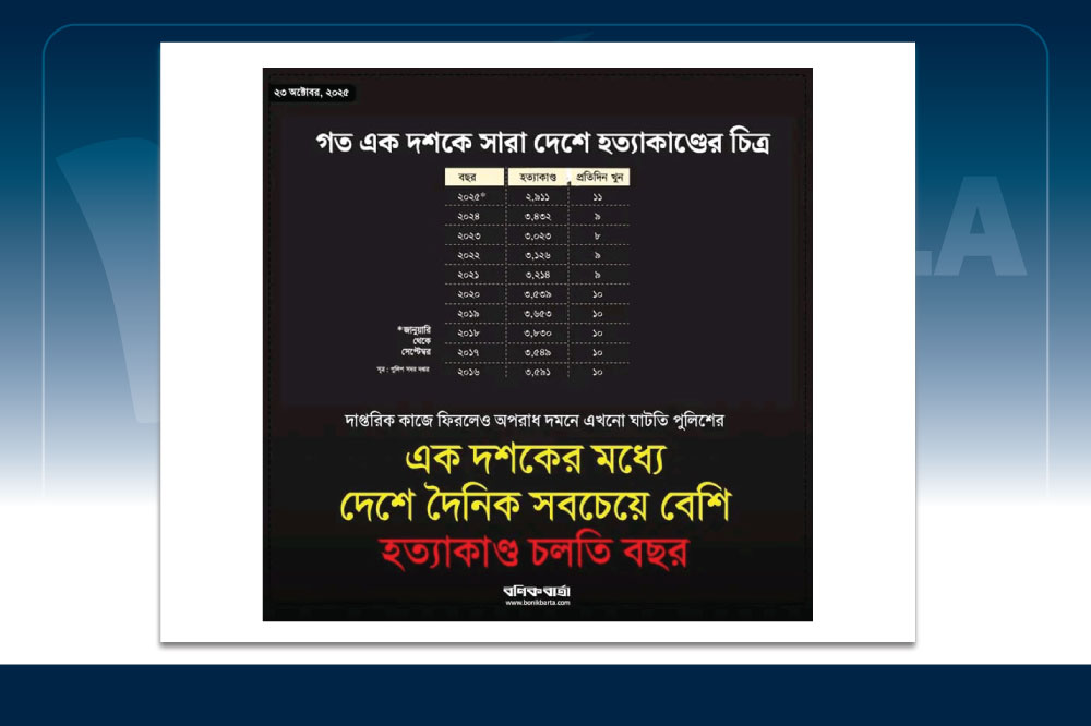 পুলিশের অপরাধ বিষয়ক পরিসংখ্যান থেকে বণিকবার্তা ‘এক দশকের মধ্যে দেশে দৈনিক সবচেয়ে বেশি হত্যাকাণ্ড চলতি বছর’ শিরোনামে একটি প্রতিবেদন করেছে। শিরোনামটি বিভ্রান্তিকর প্রধানত দুটো কারণে। প্রথমত, এই পরিসংখ্যান হত্যা-মামলা দায়েরের, হত্যাকাণ্ডের নয়। দ্বিতীয়ত, এই পরিসংখ্যানে শেখ হাসিনার শাসনামলে সংঘটিত হত্যাকাণ্ডের মামলাও যুক্ত হয়েছে। পুলিশ সদর দপ্তরের পরিসংখ্যানের বণিকবার্তা যে...