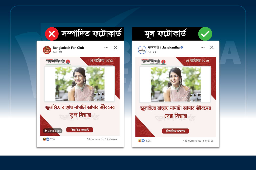 অভিনেত্রী আজমেরী হক বাঁধন ‘জুলাইয়ে রাস্তায় নামাটা আমার জীবনের ভুল সিদ্ধান্ত’ বলে মন্তব্য করেছেন, এমন দাবি করে দৈনিক জনকণ্ঠ-এর লোগো ও ডিজাইন সম্বলিত একটি ফটোকার্ড সম্প্রতি সামাজিক যোগাযোগ মাধ্যম ফেসবুকে ছড়িয়ে পড়েছে।