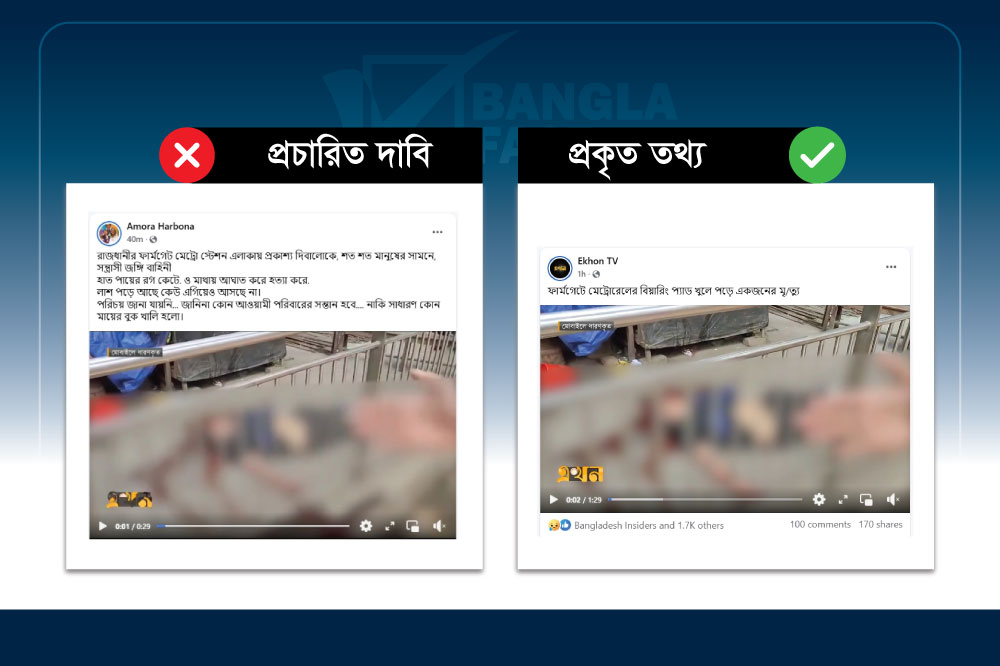 সামাজিক যোগাযোগমাধ্যমে সম্প্রতি ছড়িয়ে পড়া একটি ভিডিওতে দাবি করা হচ্ছে, ফার্মগেট মেট্রোস্টেশন এলাকায় প্রকাশ্যে সন্ত্রাসী জঙ্গি বাহিনীর সদস্যরা একজনের হাত-পায়ের রগ কেটে এবং মাথায় আঘাত করে হত্যা করেছে। তবে অনুসন্ধানে দেখা গেছে, ভিডিওটি হত্যাকাণ্ডের ঘটনার নয় বরং দুর্ঘটনার। আজ রোববার (২৬ অক্টোবর) বেলা সাড়ে ১২টার দিকে ফার্মগেট এলাকায় মেট্রোরেলের বিয়ারিং প্যাড খুলে নিচে পড়...