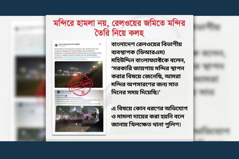 রাজধানীর খিলক্ষেতে হিন্দু মন্দিরে স্থানীয় মুসলমানদের হামলার বিষয়ে প্রচারিত তথ্যটি বিভ্রান্তিকর।