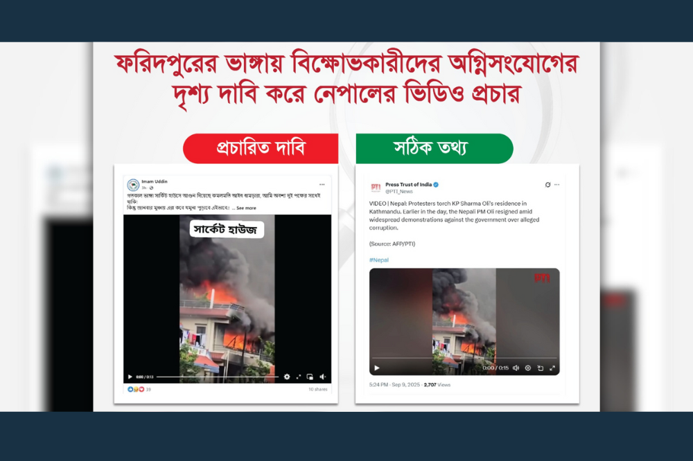 আলোচিত ভিডিওটি থেকে কিছু স্থিরচিত্র নিয়ে রিভার্স ইমেজ সার্চ করলে আন্তর্জাতিক গণমাধ্যম সংস্থা Press Trust of India এর এক্স অ্যাকাউন্টে গত সেপ্টেম্বর প্রকাশিত একটি ভিডিওর মিল পাওয়া যায়। ভিডিওটির ক্যাপশন থেকে জানা যায়, নেপালে যুব-আন্দোলনের অভিমুখে সেদিন দেশটির প্রধানমন্ত্রী কে.পি. শর্মা অলি পদত্যাগ করেন। পরবর্তীতে বিক্ষোভকারীরা কে.পি. শর্মা অলির বাসভবনে আগুন দেয়।