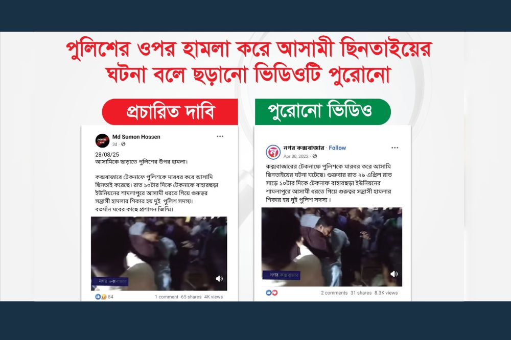 অর্থাৎ, গত ২৮ আগস্ট কক্সবাজারের টেকনাফ উপজেলার বাহারছড়া ইউনিয়নের শামলাপুরে পুলিশের ওপর হামলা করে আসামি ছিনিয়ে নেওয়ার ঘটনা ঘটেছে দাবি করে পুরোনো ভিডিও প্রচার করা হয়েছে ; যা বিভ্রান্তিকর।