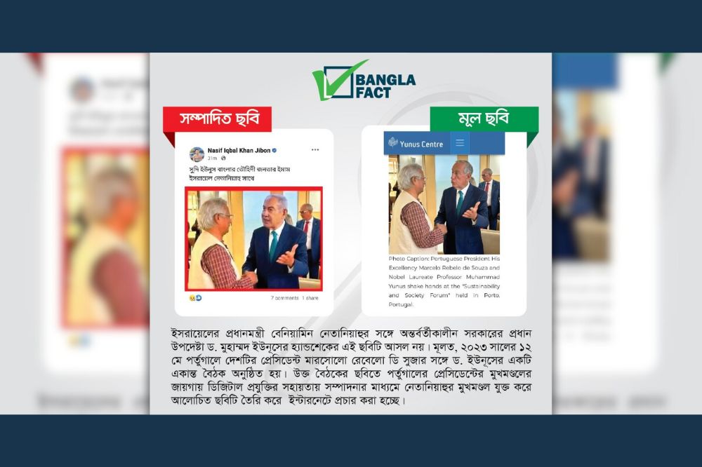ইসরায়েলের প্রধানমন্ত্রী বেনিয়ামিন নেতানিয়াহুর সঙ্গে অন্তর্বর্তীকালীন সরকারের প্রধান উপদেষ্টা ড. মুহাম্মদ ইউনূসের হ্যান্ডশেকের এই ছবিটি এডিটেড।